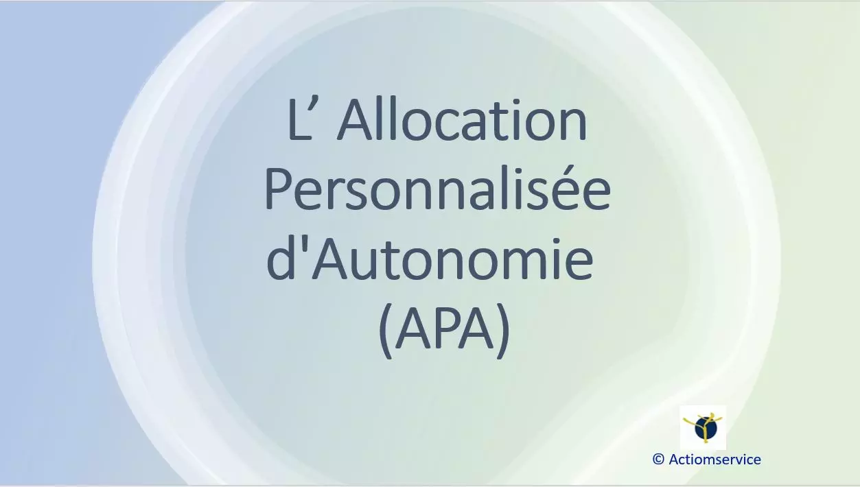 L' Allocation Personnalisée d’Autonomie (APA) est une allocation qui permet d’aider à financer les dépenses nécessaires pour rester vivre à domicile malgré la perte d’autonomie (aide pour accomplir les actes essentiels de la vie quotidienne : se lever, se laver, s’habiller …).